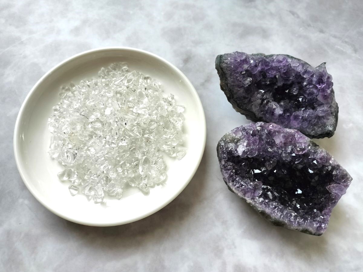 私の日々のお手入れは、万能な浄化石「アメシスト(紫)」「クォーツ(透明)」の上に使用後のブレスレットを置いています。