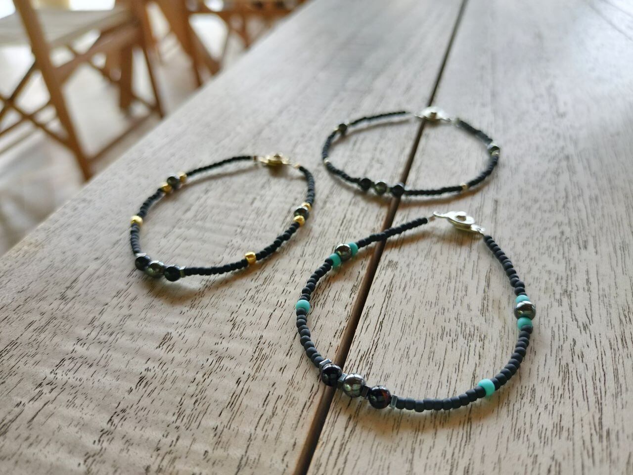 黒を基調にしたパワーストーンとビーズを使用し、マットなターコイズブルーのカラーアクセントでカジュアルな装いやクールな装いにも。